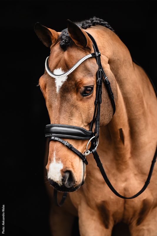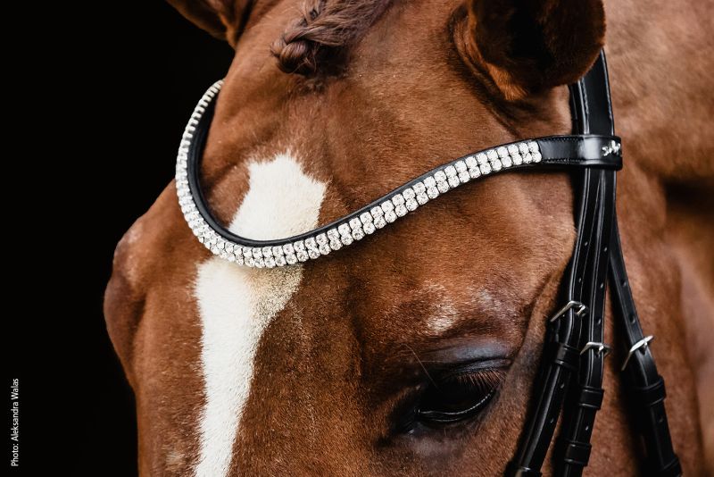 Тонкий налобник з двома рядами незграбних кристалів надає вуздечці вишуканий, блискучий вигляд.