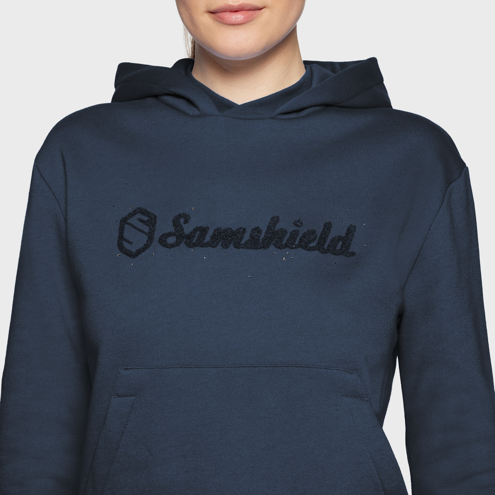 Текстурований логотип Samshield, вишитий голкою, з декором Swarovski® Crystal Décor спереду