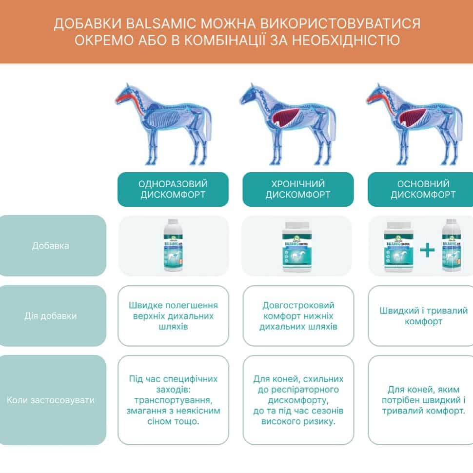 Респіраторний асортимент Audevard пропонує 2 добавки з науково схваленими інгредієнтами: Balsamic Air і Balsamic Control. Ці 2 продукти мають взаємодоповнюючу дію, щоб забезпечити загальну підтримку дихальної системи вашого коня. Скористайтеся таблицею нижче, щоб дізнатися, який продукт використовувати та коли.