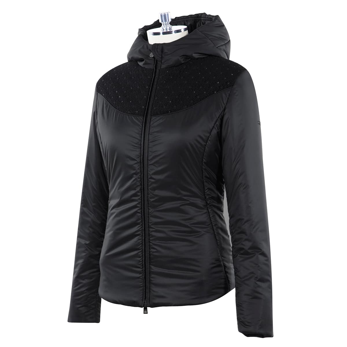Оздоблення кристалами робить цю куртку жіночною та модною, а просторий капюшон забезпечує додатковий захист від негоди.