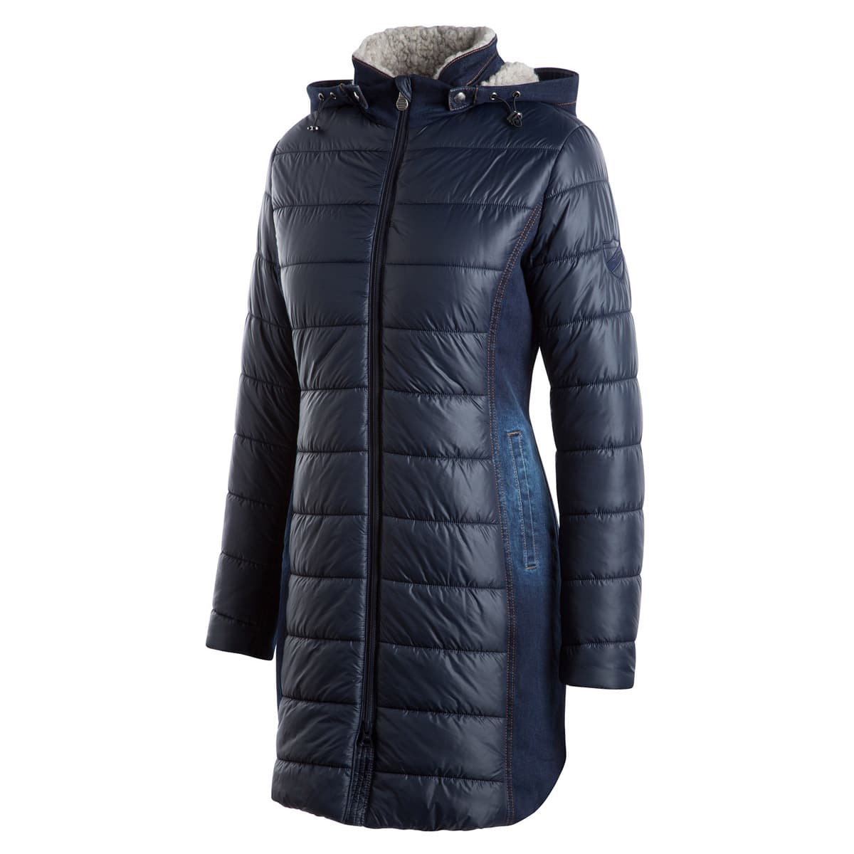 Елегантне, зимове пальто з високим коміром і регульованим капюшоном